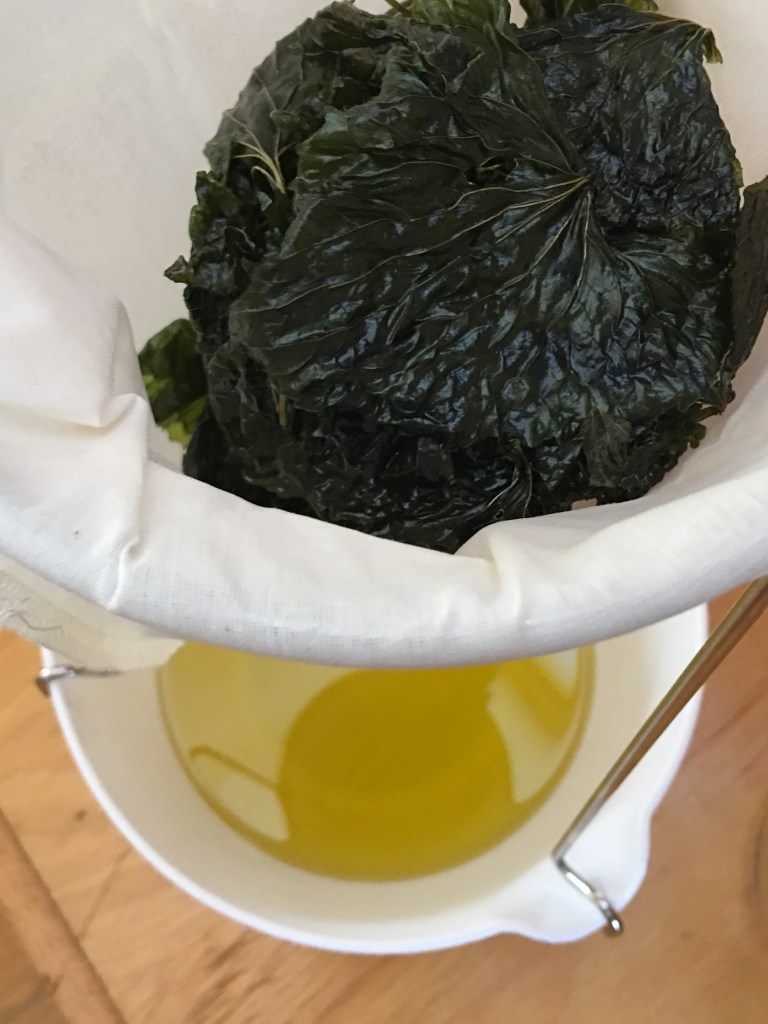 When your oil turns a beautiful herbal golden green, it’s ready. Pour the oil through a filter, such as a coffee filter or cloth. Warm oil drains better.