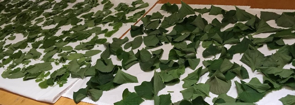In a cool area out of direct sun light, lay the leaves on a dry paper towel or cloth one inch apart. I like to use my kitchen table to dry all my herbs. That way, they are always in sight, so I’ll remember to check on them. Turn the leaves every day, for 2-3 days. They will be crunchy when dried.