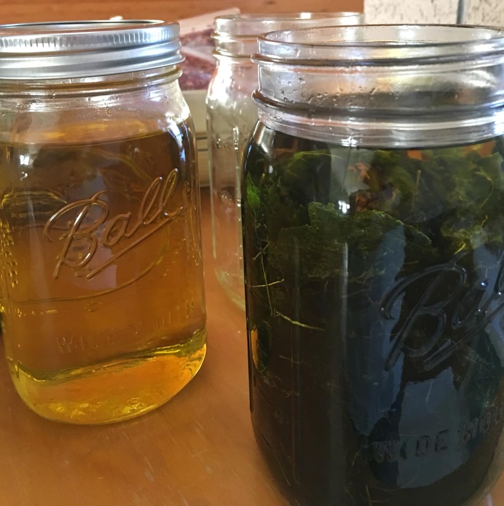 Pour a carrier oil to cover the leaves. I like to use sunflower, and/or evening primrose.