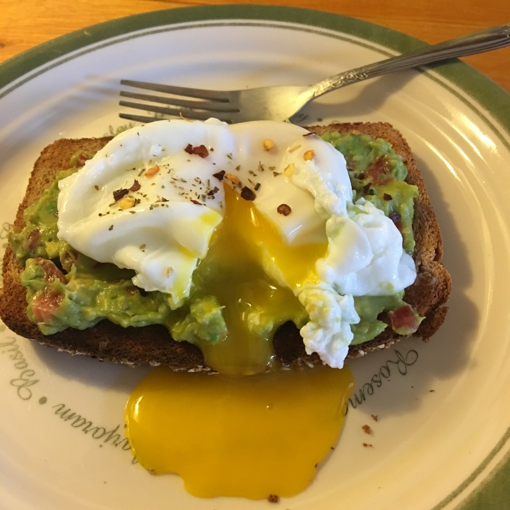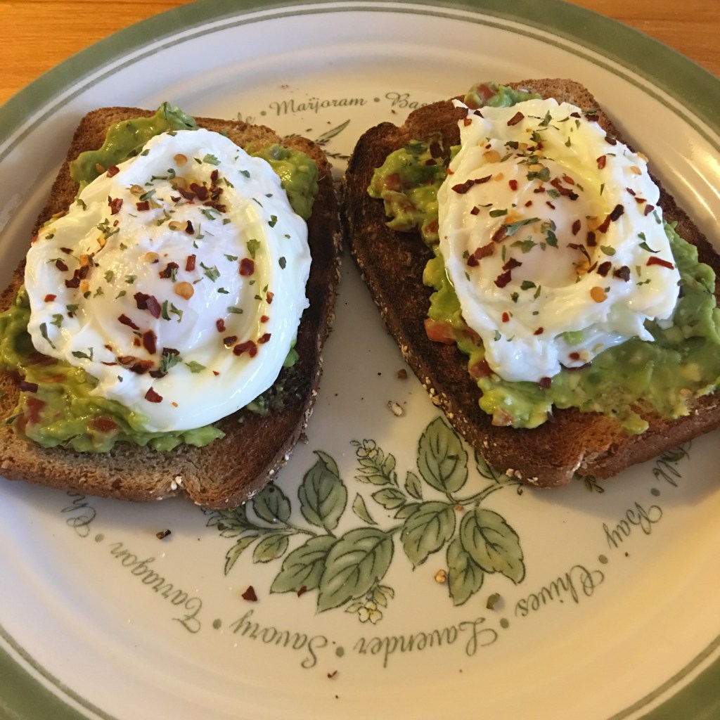Soft boiled or poached eggs (one on each toast), tuna salad, sprouts, red pepper flakes, nuts, seeds, or dried herbs such as marjoram, basil, oregano, parsley, and chives.