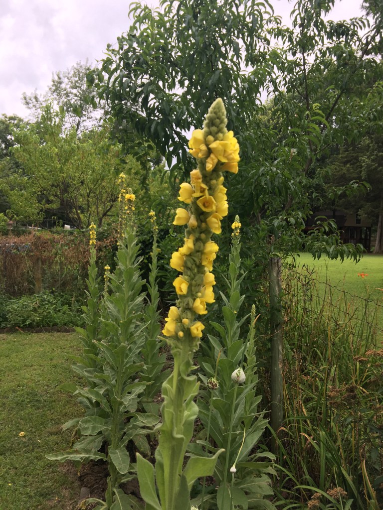 This is mullein growing in my garden. It has large fuzzy leaves and has a tall flower stalk in its second year. Small yellow flowers grow along the stalk. You will be collecting this flowers to make the ear drops.
