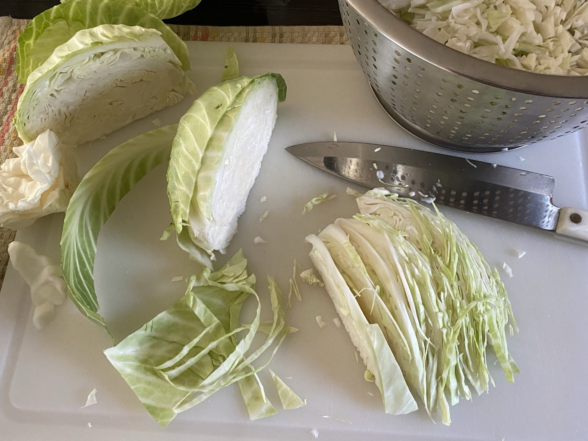 Quarter the cabbage and remove the cores. Then slice the cabbage thinly, 1/8-inch thick is perfect but it doesn’t have to be perfect. Chop it the way you want.