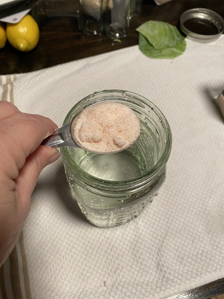 Mix in a glass jar filtered water and 1 Tablespoon salt. Mix unstill salt is dissolved. Pour over packed cabbage to one inch from the top.